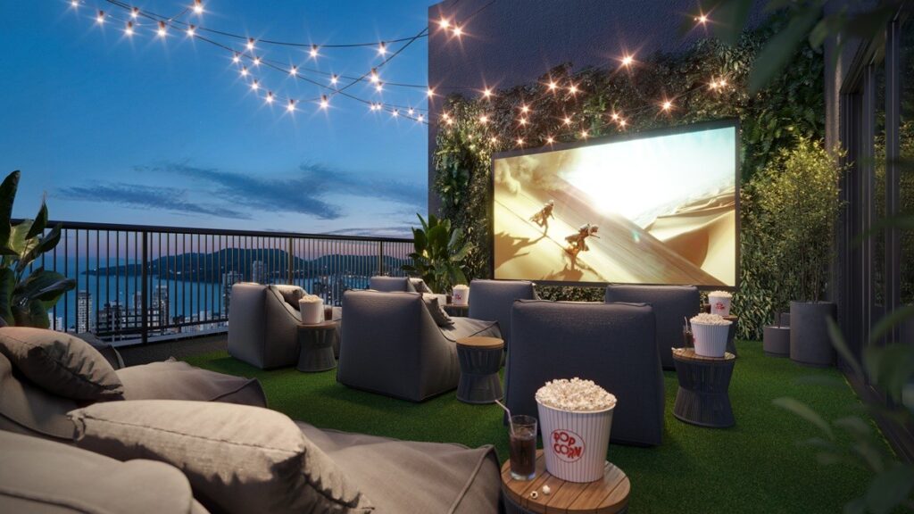 A proposta central deste empreendimento é um cinema que combina tecnologia de ponta com a beleza natural da paisagem litorânea. A tela, com aproximadamente 152 polegadas – o equivalente a 3,3 metros por 2 metros –, será equipada com projeção 4K de alta performance, garantindo uma qualidade visual excepcional. Para a conveniência dos moradores, o sistema contará com acesso nativo às principais plataformas de streaming. Um mecanismo automatizado protege o projetor quando inativo e o posiciona com um simples toque de botão. O ambiente será mobiliado com poltronas e sofás, criando um espaço de lazer exclusivo para residentes e seus convidados, ideal para desfrutar de filmes sob as estrelas, com a brisa do mar e uma vista deslumbrante, condicionado, naturalmente, a dias de bom tempo.