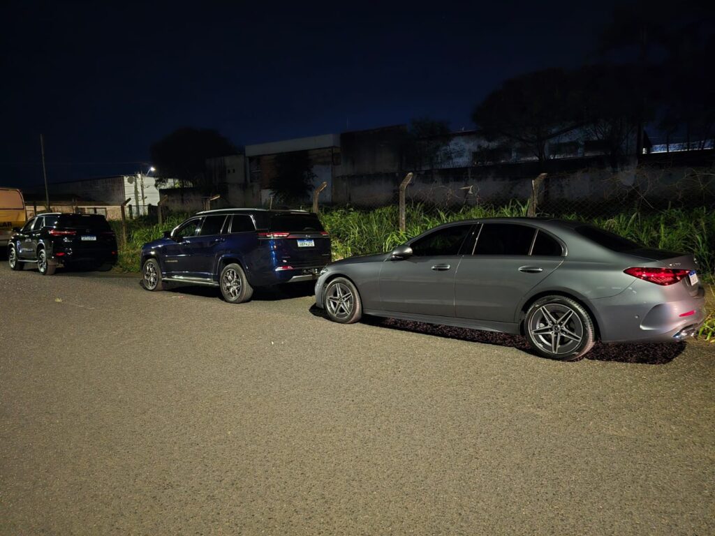 Foram apreendidos uma pistola calibre 380, 13 munições, quatro celulares, três veículos de luxo e documentos falsos.